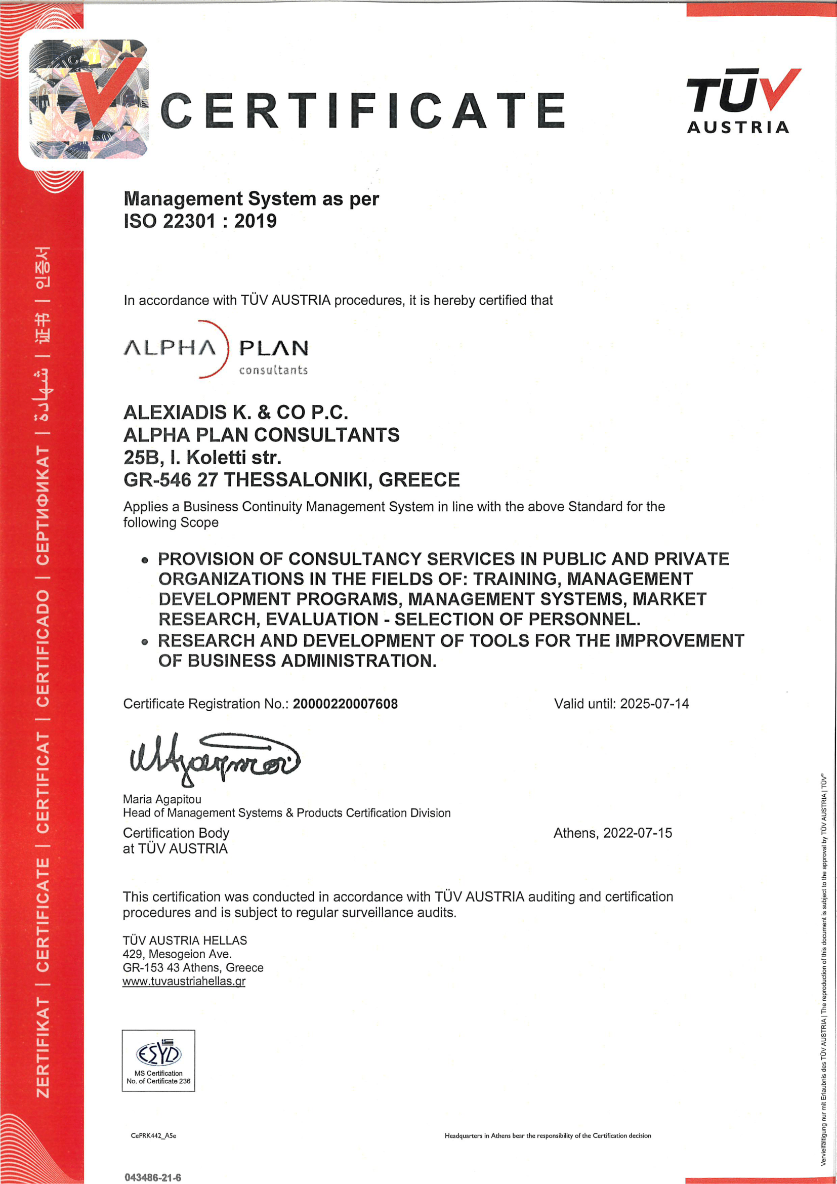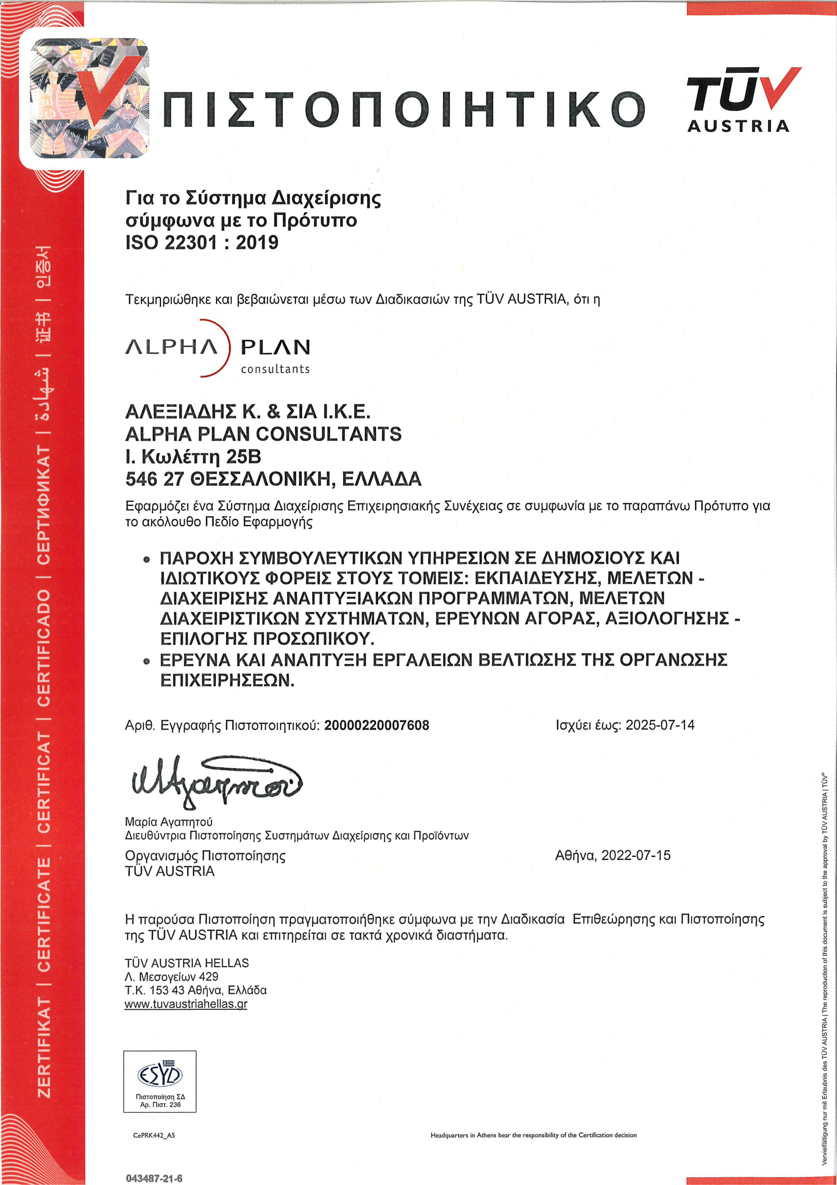 Η ΑΛΕΞΙΑΔΗΣ Κ. & ΣΙΑ Ι.Κ.Ε. με διακριτικό τίτλο ALPHA PLAN CONSULTANTS ανταποκρινόμενη στις απαιτήσεις της σύγχρονης επιχειρηματικής πραγματικότητας και όντας μία εκσυγχρονισμένη, μακρόπνοη επιχείρηση, αναγνωρίζει την αναγκαιότητα ομαλής και αδιάκοπης λειτουργίας, προς όφελος των πελατών, διοικητικών στελεχών και άλλων ενδιαφερόμενων μερών της, με σκοπό να παρέχει συνεχή λειτουργία, αποφάσισε να σχεδιάσει και να εγκαταστήσει ένα Σύστημα Διαχείρισης Επιχειρησιακής Συνέχειας (ΣΔΕΣ), σύμφωνα με τις απαιτήσεις του Διεθνούς Προτύπου ISO 22301:2019.